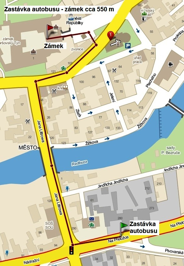 Do Horšovského Týna máte možnost přijet linkovýmy autobusy Plzeň - Domažlice. Spoje jezdí každou hodinu. Bližší informace ke spojům naleznete zde. Autobusová zastávka se nachází u hlavní silnice (Plzeň - Folmava). Cestu ze zastávky přímo na zámek vidíte na tomto obrázku.