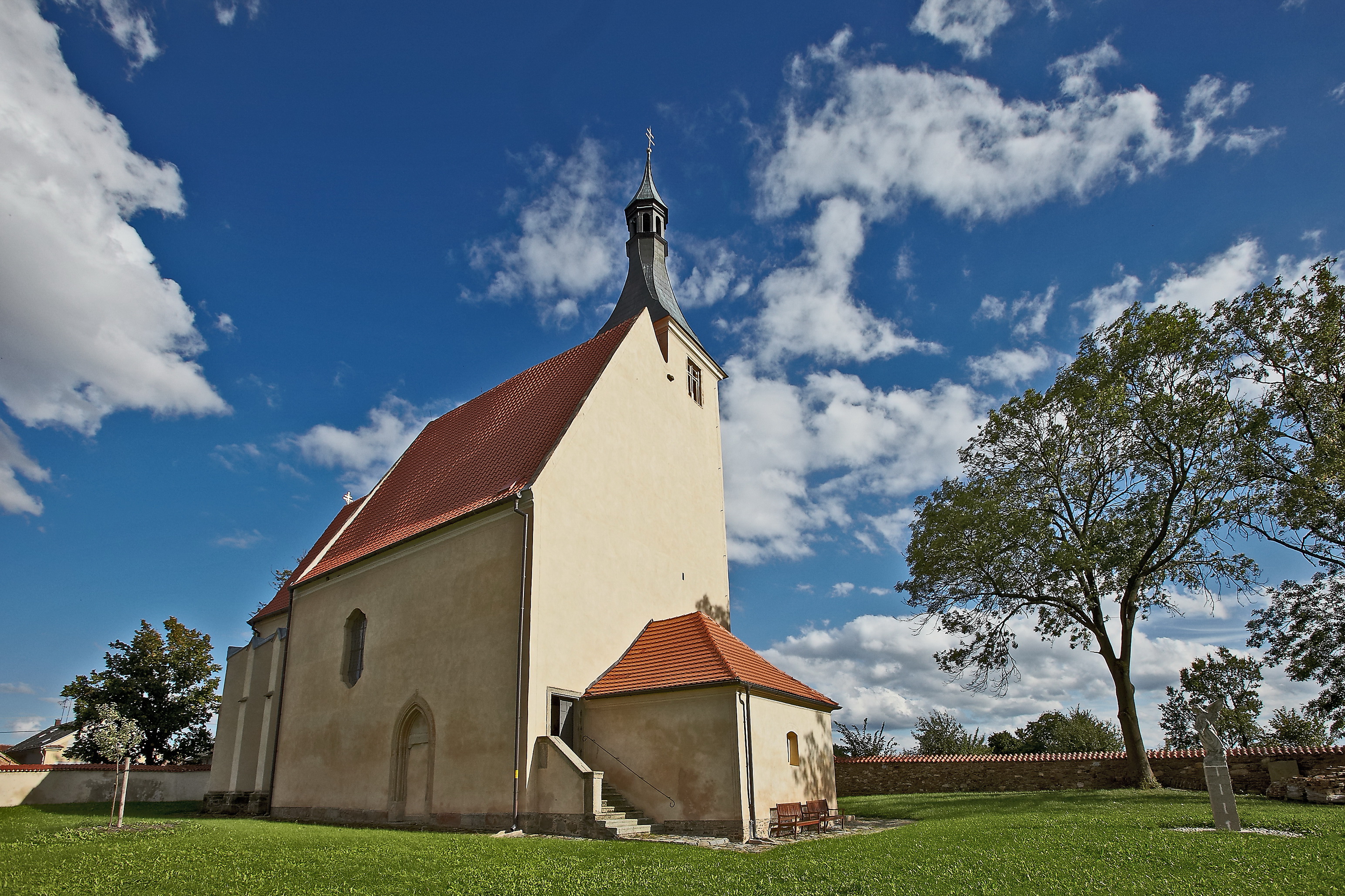 In den 60er Jahren des 14. Jahrhunderts wurde die romanische Kirche im gotischen Stil umgebaut. Erweitert wurde dabei die Anlage um ein Presbyterium mit einem fünfeckigen Schluss, einem äusseren Stützsystem und zwei Kreuzgewölbefeldern. Der Innenraum wurde mit Wandmalereien verziert, die verschiedene Symbole der Evangelisten, sowie Gestalten der Allerheiligen darstellen. Jene Form bewahrte sich die Anlage, grundsätzlich genommen, bis heute. Nach den Ergebnissen der dendrochronologischen Untersuchung stammt die einzigartige Dachstuhlkonstruktion der Kirche aus dem Jahre 1363; was die gotischen kirchlichen Bauten Böhmens betrifft, gehört sie dadurch zu den ältesten Konstruktionen dieser Art. Noch in der gotischen Zeit wurde zur Südseite des Presbyteriums die Kapelle St. Barbara zugebaut. Ihre ursprünglichen Malereien wurden im Jahre 1489 von Wandmalereien mit den Szenen aus dem Leben der heiligen Barbara übergedeckt. Zu Beginn des 16. Jahrhunderts wurde das Aussehen der Anlage von einem schmalen Turm mit einer Glocke aus derselben Zeit ergänzt.